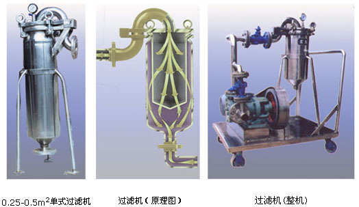 该种过滤机是一种压力式过滤装置,待滤液在泵作用下,滤液通过所需要细度等级的滤袋能获得合格的滤液。该机更换滤袋十分方便,过滤基本无物料消耗。该机有设计成单过滤机,双联过滤机,并可配套输送泵组装在移动式推车上。过滤机滤袋保护网均为不锈钢制作,其余部件有分碳钢和不锈钢制作两种,供过滤不同介质的用户选择。